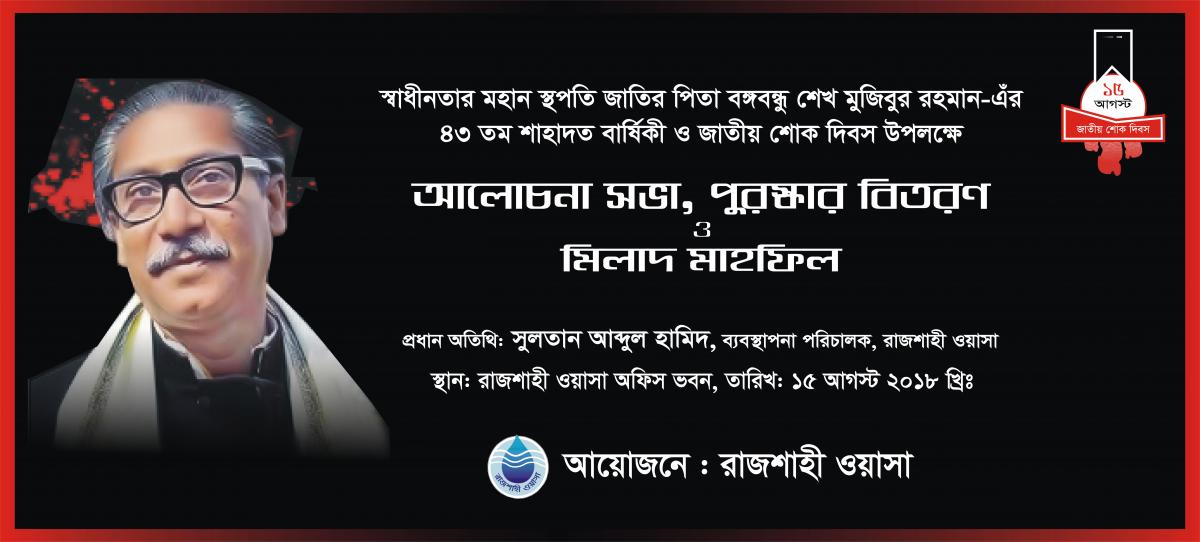 • স্বাধীনতার মহান স্থপতি জাতির পিতা বঙ্গবন্ধু শেখ মুজিবুর রহমানের ৪৬তম শাহাদত বার্ষিকী ও জাতীয় শোক দিবস ২০২১ উপলক্ষ্যে রাজশাহী ওয়াসার আয়োজনসমূহ