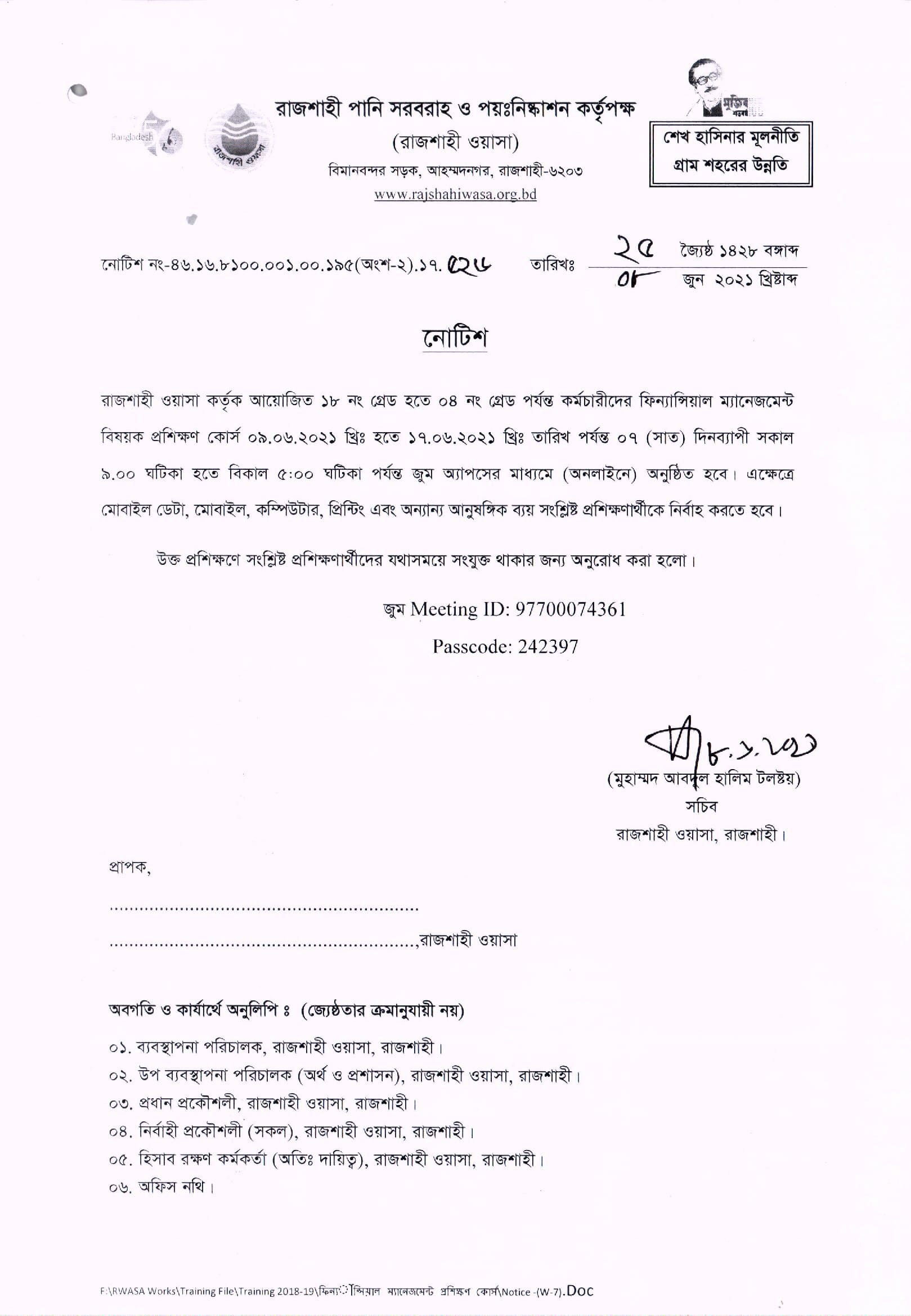 ফিন্যান্সিয়াল ম্যানেজমেন্ট বিষয়ক প্রশিক্ষণ কোর্স, রাজশাহী ওয়াসা, রাজশাহী